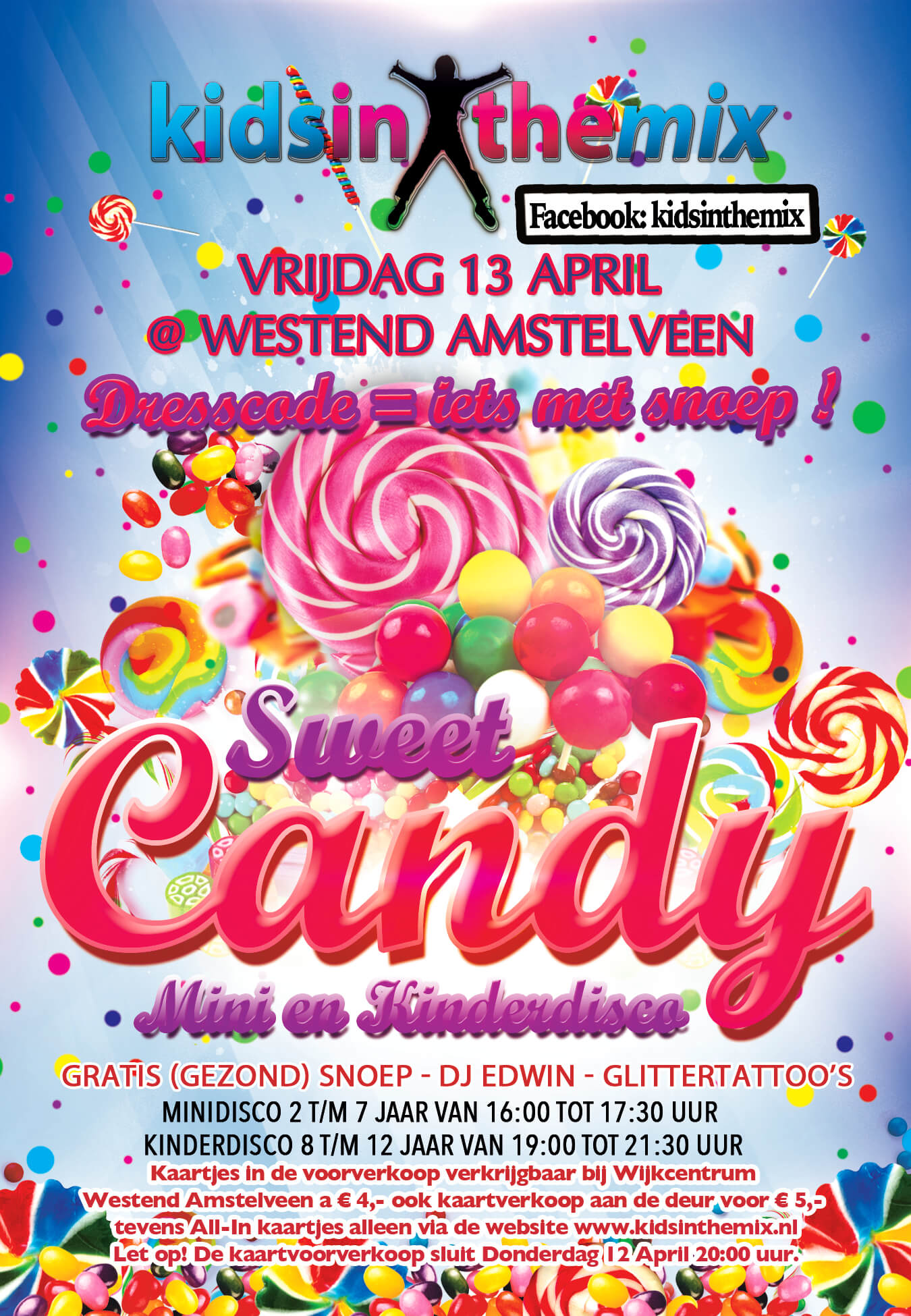 Dit keer een week eerder als normaal in Westend, maar dan is de zoetste en gezondste disco van Amstelveen er weer. De Kids in the Mix Sweet Candy Disco. Het zou helemaal super tof zijn als je in kleding komt wat te maken heeft met snoep, ijsjes, groente, etc. Zien wij jullie ook weer bij de gezelligste en leukste disco van Amstelveen en omstreken? Tot dan!